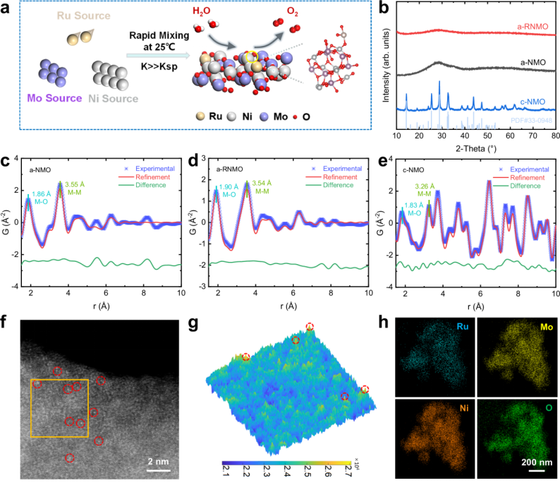 针对以上问题,学院马吉伟教授团队设计了一种室温下一步过饱和共沉淀法得到锚定Ru单原子的非晶NiMoOx,该催化剂在碱性电解槽中展现出优异的应用潜力。原位表征和理论计算表明,单原子和非晶结构在电催化反应中起着至关重要的协同作用。以上研究验证了在非晶材料中锚定贵金属单原子,为贵金属催化剂取得高催化性能和经济效率之间的平衡提供了前瞻性策略。