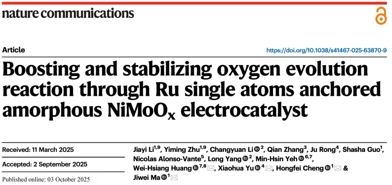 10月3日,《自然·通讯》(Nature Communications)在线发表了6776永利集团马吉伟教授团队及其合作者的研究论文“Boosting and stabilizing oxygen evolution reaction through Ru single atoms anchored amorphous NiMoOx electrocatalyst”。该研究构建了一种以非晶NiMoOx为载体锚定Ru单原子的电催化材料,为在非晶氧化物上锚定金属单原子设计高性能OER电催化剂提供了范式与依据。