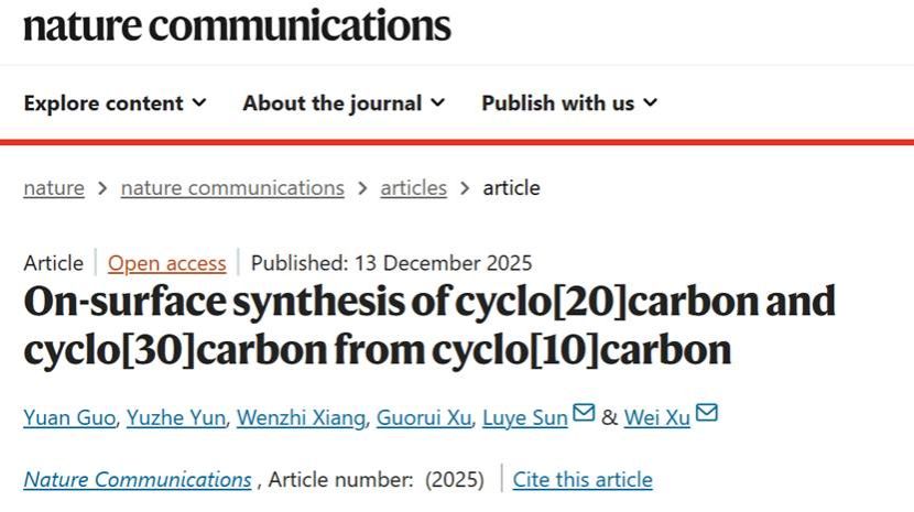 12月13日,《自然•通讯》(Nature Communications)以“加速出版”的形式在线发表了学院许维教授团队的最新科研成果《On-surface synthesis of cyclo[20]carbon and cyclo[30]carbon from cyclo[10]carbon》。该研究创新性的提出了“偶联-开环”的环型碳制备新策略,即以环型碳C10为前驱体,通过针尖操纵成功合成环型碳C20和C30,为大尺寸环型碳的精准制备开辟了新路径。