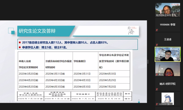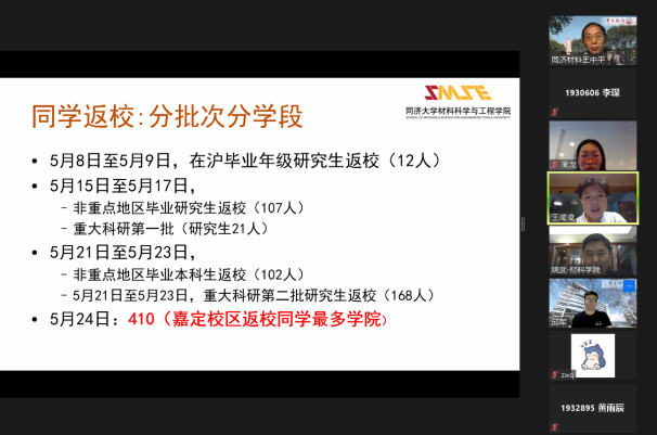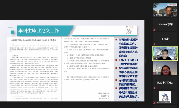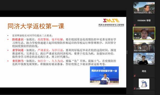 5月24日晚19时30分,在三个批次共三百余位本研同学顺利复学返校后,为保障师生校园健康平安,严格规范学校学院相关规定,6776永利集团组织返校学子在线上开展了学院复学第一课,学院党委书记王中平、党委副书记王凌凌、副院长邱军和姚武出席,分别为同学们讲述了防疫期间的日常管理、毕业进展安排以及实验室安全等具体要求。学院320余位本研返校学子在线聆听。