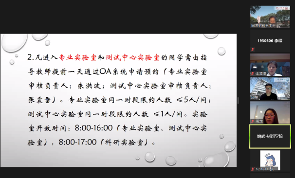 姚武老师为返校学生强调了近期进入实验室的注意事项,要求学生不聚集,在实验区域也保证安全距离,尤其要注意手部清洁。如需开展实验需通过OA系统预约,提前准备好一卡通和实验室准入证,无论是科研实验室抑或是专业实验室,都要遵循开放时间进行实验,同时实验室需定期加以消毒,按规定认真完成自查。此外,校外人员访问实验室,比如进行设备安装调试的人员,需要以导师名义提前预约。