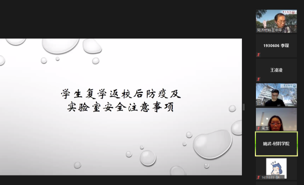 王凌凌老师与同学们重新强调了yl6776永利集团返校复学第一课的相关内容,并详细介绍了学院防疫工作的管理规定,特别提到同学们防疫意识不放松,每日继续按时信息上报,校园封闭管理实行外出请假报备制度,平时社区、实验室以及学校图书馆等公共场合不聚集,非必要不串门等。学院各楼宇严格登记,按时间要求进出,务必遵守疫情下实验室安全管理规定。同时也应调整学习状态,尽快投入毕业及科研相关工作。此外王凌凌书记还提醒同学积极调节自己的心理状态,合理疏导负面情绪,遇到困难及时与导师和相关负责老师沟通。