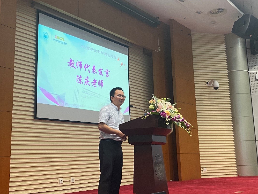 2021级研究生新生代表龙腾宇在发言中抒发了在中国共产党百年华诞之际可以与党与国家一同奋进的幸运,成为一名同济研究生的欣喜,也同时确立了研究生生活的目标:要培养科研兴趣,养成严谨求实的科研习惯;兼顾德才发展,身体力行,踏实做人;心怀远大理想,仰望星空,投入时代洪流。志存高远,坚定理想信念,在研究生阶段找寻到自己的人生方向。经历千锤百炼,以“同舟共济,自强不息”的精神武装自己,努力成为对材料领域、对学校建设、对国家发展、民族复兴、人类进步有所贡献的青年才俊!