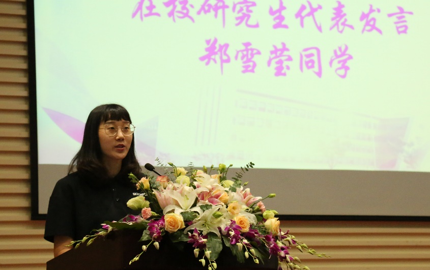 学院2019级春季博士研究生、2021年学校“追求卓越学生奖”获得者郑雪莹同学作为老生代表发言。她将自己的心得体会毫无保留地分享给在座的各位新生,首先是梦想的力量,研究生阶段将是拾起并接近梦想的最佳时机。你将有大把的时间去自主探索自己的课题,自学更多项技能,或是结识更多小伙伴。三年或者五年的硕博时间,足以让大家变得大不相同。其次是坚持的力量,必须要有长期坚持的决心,在未来的研究生生活中规划好自己的每一天,做到每天不荒废,就能每天离梦想近一点,直至成为自己领域的小专家。最后是实践的力量,材料领域的学习围绕着阅读文献,规划实验和实施实验而展开,通过不断地思考和与老师同学的讨论,得到的每一个新的实验方案都是一种进步,大家在不知不觉中得到了成长。