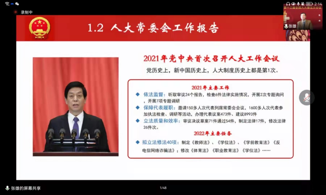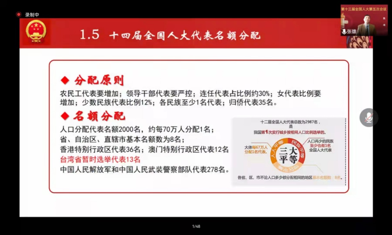 在本次报告会中,张雄教授从政府工作报告、人大常委会/人大常委会委员工作报告、两高院工作报告、地方人大组织和政府组织法议案以及十四届全国人大代表名额分配这5个方面依次展开解读,同时也畅谈了自己作为台湾团人大代表的独特感受。