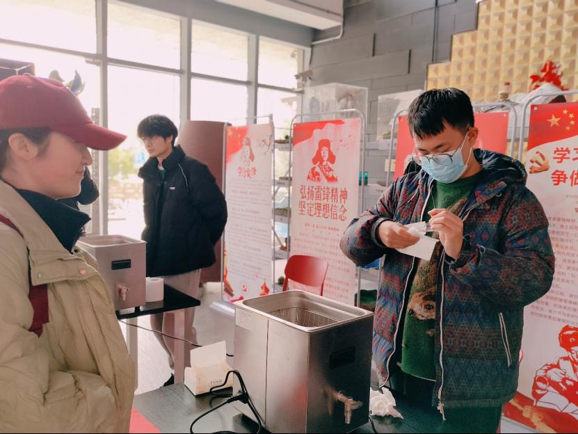 利用实验室的超声波清洗机为师生义务提供眼镜清洗服务。活动现场,志愿者们手法娴熟,耐心细致地为每一位老师同学服务,弘扬并践行雷锋精神,以奉献诠释其深刻内涵,以青春奏响时代凯歌!