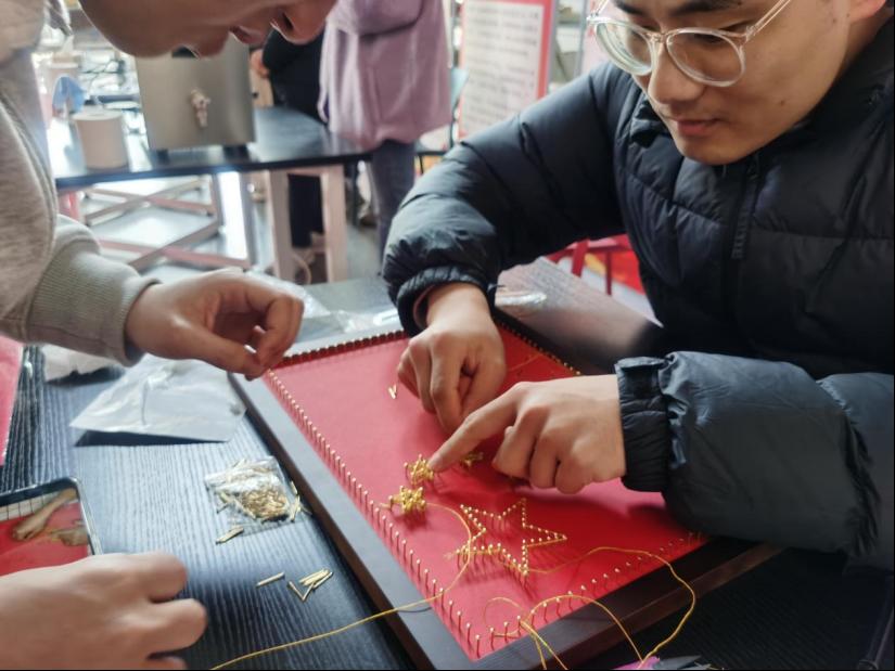 研究生第三党支部的同志们在此次学雷锋系列主题活动中制作了“党旗飘飘”和“雷锋画像”两幅绕线画。首先用一颗颗螺丝钉勾勒出图案的轮廓,再通过丝线反复缠绕将图案内部填充不同的颜色。弘扬雷锋精神要从当下干起,从小事做起,用一点一滴的实际行动做实事。绕线画工艺繁琐,需要极大的耐心,一个步骤出错可能前面已完成的部分都要重新来,但遇到困难不放弃,坚持到底才能胜利,从中体会到了雷锋艰苦奋斗、敢于斗争的精神。