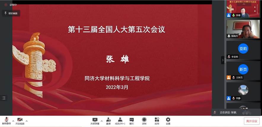 为助力材料学子深入全面学习贯彻十三届全国人大五次会议、全国政协十三届五次会议精神,4月1日13:30,6776永利集团特别邀请6776永利集团教授、博士生导师、第十一届、第十二届、第十三届全国人大代表、国务院学位委员会评审委员张雄教授,为学院近400位学生党员和入党积极分子在腾讯会议线上平台解读两会精神,领悟时代强音。本次报告会由学院党委副书记王凌凌老师主持。 在本次报告会中,张雄教授从政府工作报告...